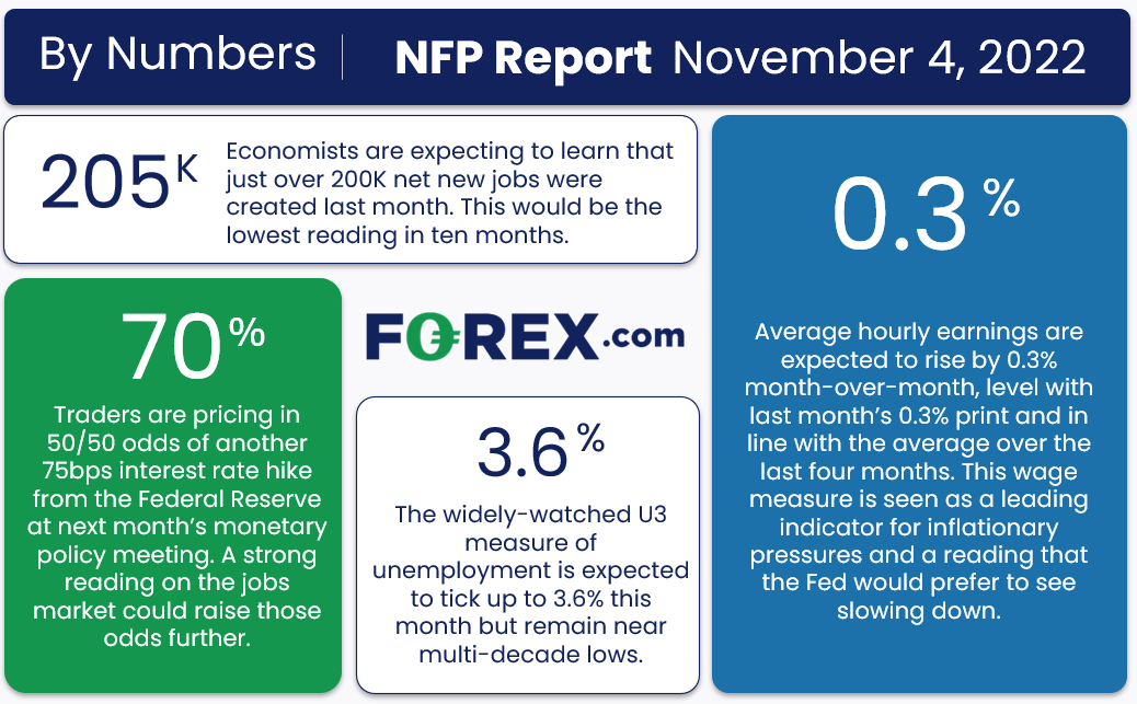 在12月中的议息会议前,非农就业报告还会发布两次,CPI数值也会再更新一次,交易者目前自然无法预期美联储动态。根据芝商所FedWatch工具,五成交易者认为美联储将继续75个基点的加息幅度,而另一半则认为加息幅度会降至50个基点,因此无论本月就业报告数据走势如何,市场波动性都很可能提高。就10月非农就业报告而言,普遍预期认为将新增20.5万净新增岗位,平均小时薪预期环比增加0.3%: