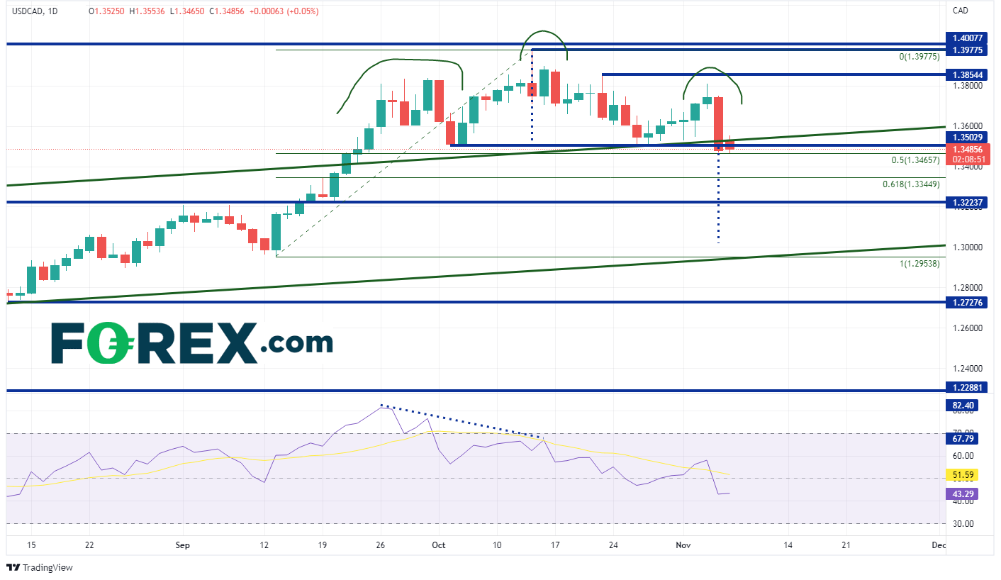 由于周五超预期的就业数据变化,以及美元走弱,美元/加元打破了头肩形态的颈线位1.3502,距离从9月13日低点到10月14日高点的50%回档位1.3466附近仅差几个点位。 周一交投清淡,价格没有任何波动。不过,市场似乎只是在等待下一个能推动该货币对走低的基本面消息。 头肩形态的目标位是从颈线被突破的价位,到顶部与颈线之间的距离。 因此,目标位在1.3050附近。