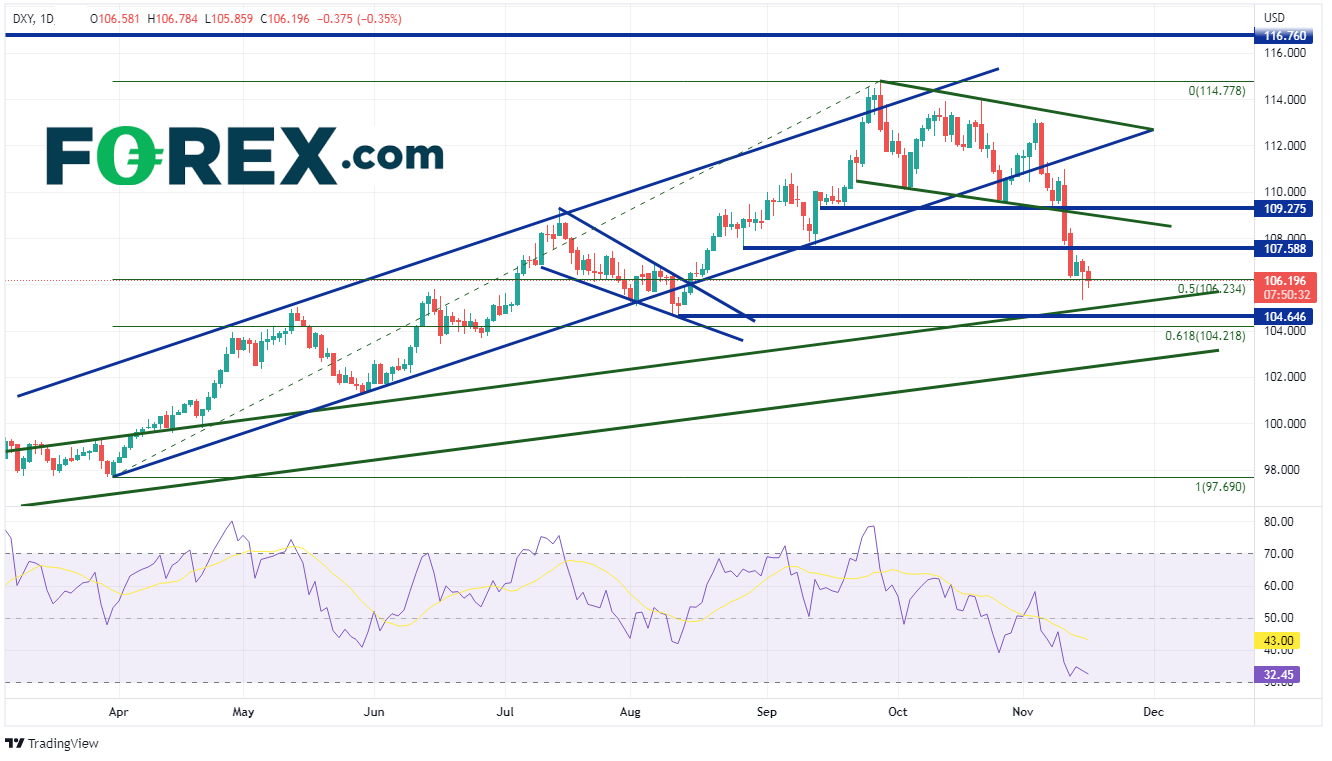 总的来说,美元并没有特别受益于超出预期的零售销售数据。持续遭受抛压的美元指数当天小幅下跌至331日低点到928日高点区间的50%回撤位106.23附近。如果继续走低,支撑位在20215月(绿色)的上行倾斜趋势线105.00附近,然后水平支撑位在811日以来的低点104.65附近。在此下方,价格可能会跌至上述区间的61.8%斐波那契回撤位104.22。但如果美元指数反弹,阻力位于前低107.59附近。在此上方,价格会受阻于近期形成的短期通道下沿109.02附近,然后是水平阻力位109.27