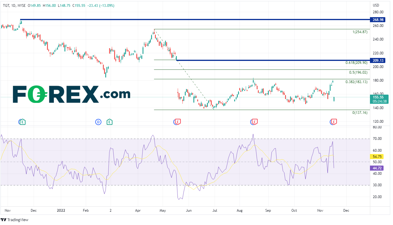 塔吉特的股价从20211115日创下历史新高268.98后大幅下跌。该股在517日公布第一季度财报后从215.28下跌至163.07。股价在630日创下年初至今的低点137.26,然后反弹至421日高点至630日低点区间的38.2%斐波那契回撤位182.13附近。但在今天公布了欠佳的业绩之后,该股从昨天收盘价178.98跌至149.85!支撑位在630日低点137.16,而阻力位在跳空缺口176.90