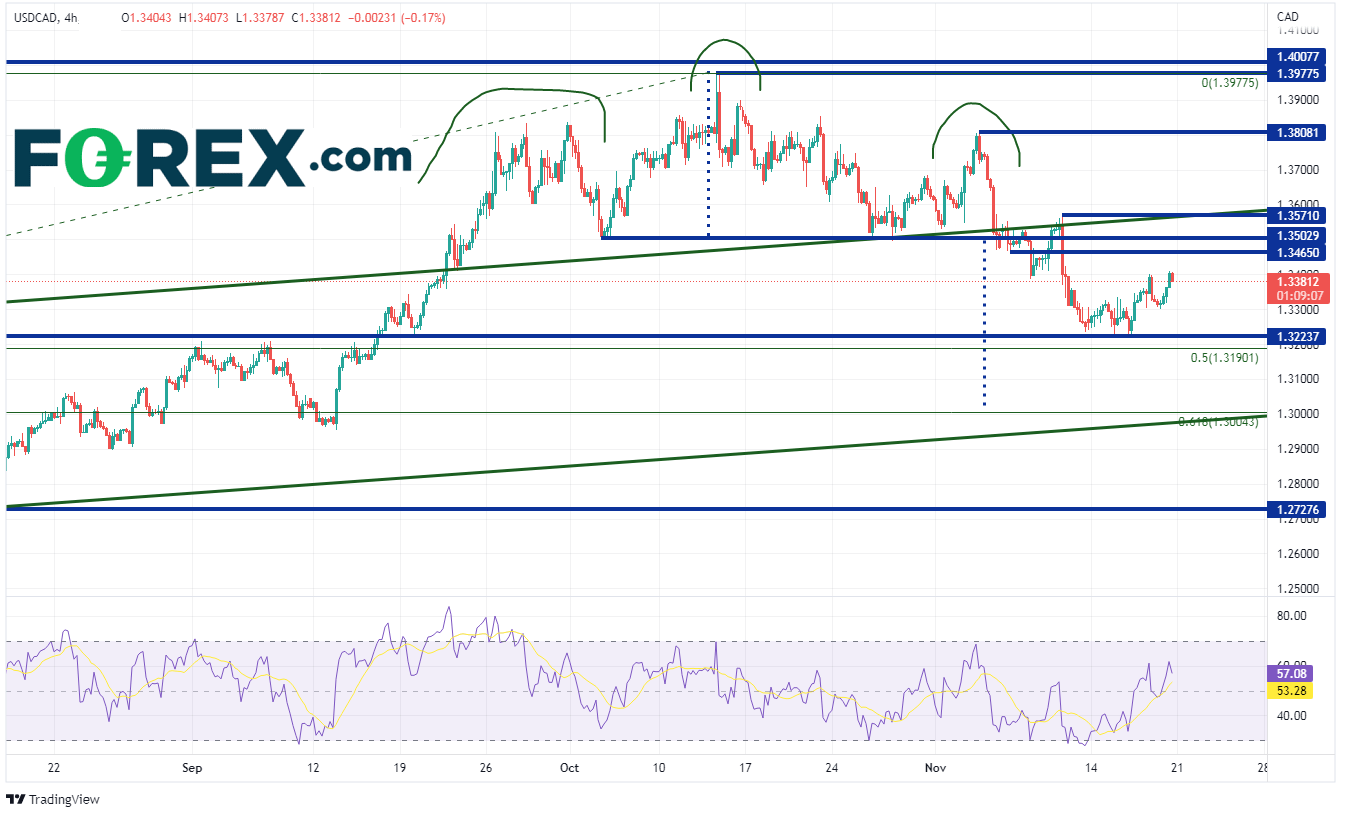 在240分钟图上,1.3465和1.3571之间存在大量的阻力。第一个阻力位于11月7日以来的低点1.3465。上方阻力位于头肩图形的颈线1.3503。下一个阻力位于11月19日以来的高点和长期上行通道(绿色)的上沿1.3571附近的交汇处。然而,如果该货币对继续走低至头肩形态目标位,第一个支撑位于7月14日高点和11月22日低点1.3224。在此下方,支撑位于4月5日低点至9月28日高点区间的50%回档位1.3190。如果美元/加元继续走低,价格可能会跌至同一区间的61.8%斐波那契回撤位1.3004。