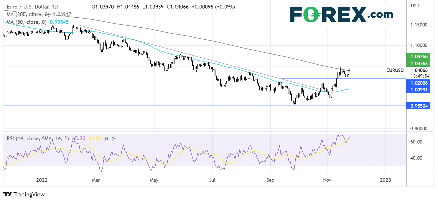 欧元/美元在早盘升至高位1.0448后,开始回落并考验200日均线1.04。RSI仍未进入超买区域,支持其进一步上涨。