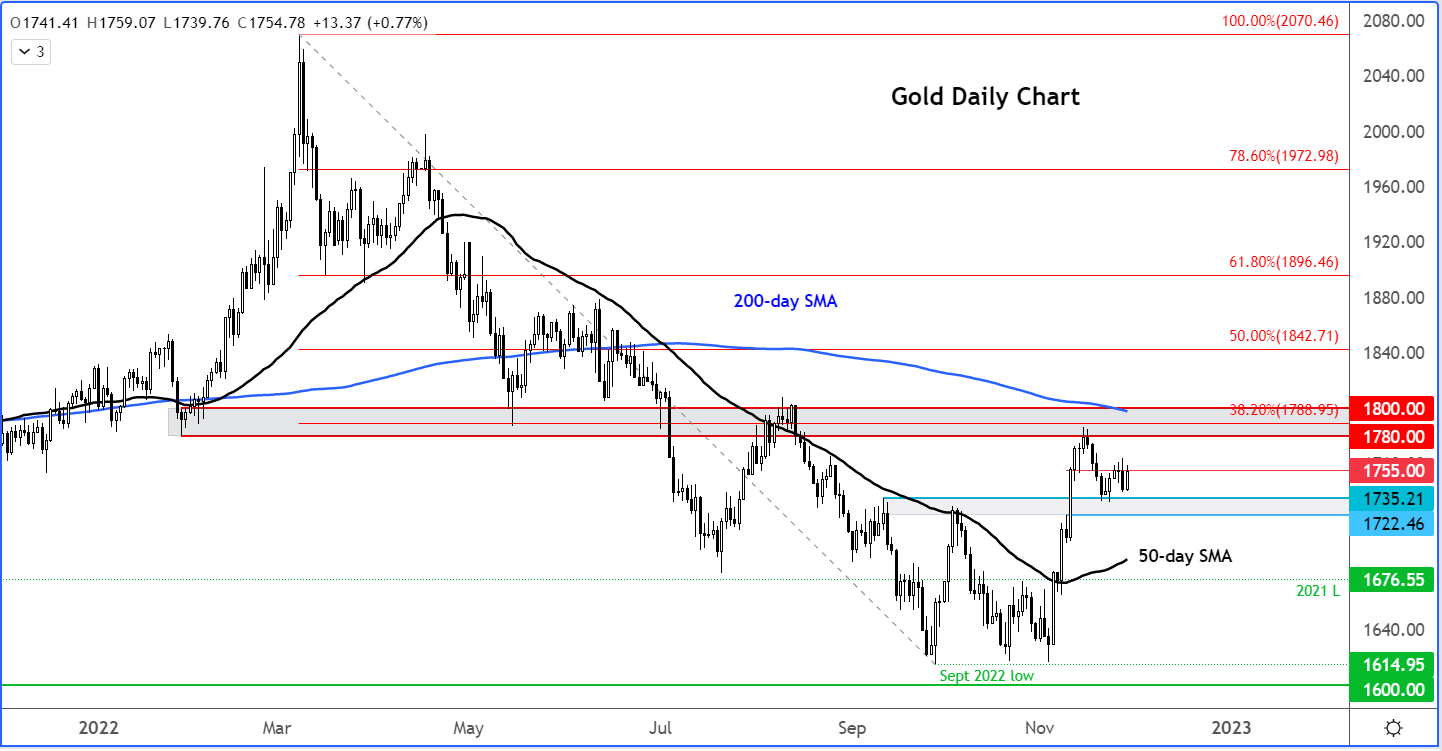 最近几天,黄金一直在两个主要区域之间停滞不前。上行受制于$1780$1800附近的强大阻力,这里曾是200日平均线(现在向下倾斜)和相对于今年高点的38.2%斐波那契点位形成的支撑位。目前,下行则在之前的阻力位$1722-$1735区域获得支撑。