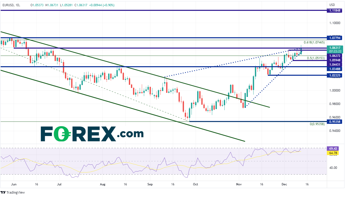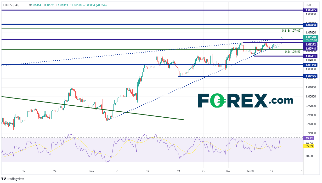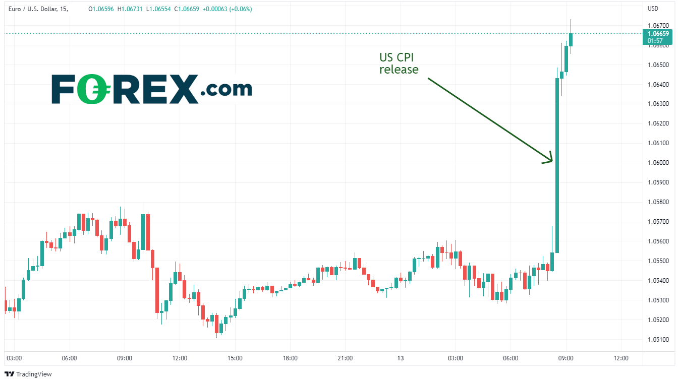 紧接CPI公布之后,欧元/美元从1.0554跳升至1.0649。截至撰稿时,该货币对在日内高点1.0673附近交投。
