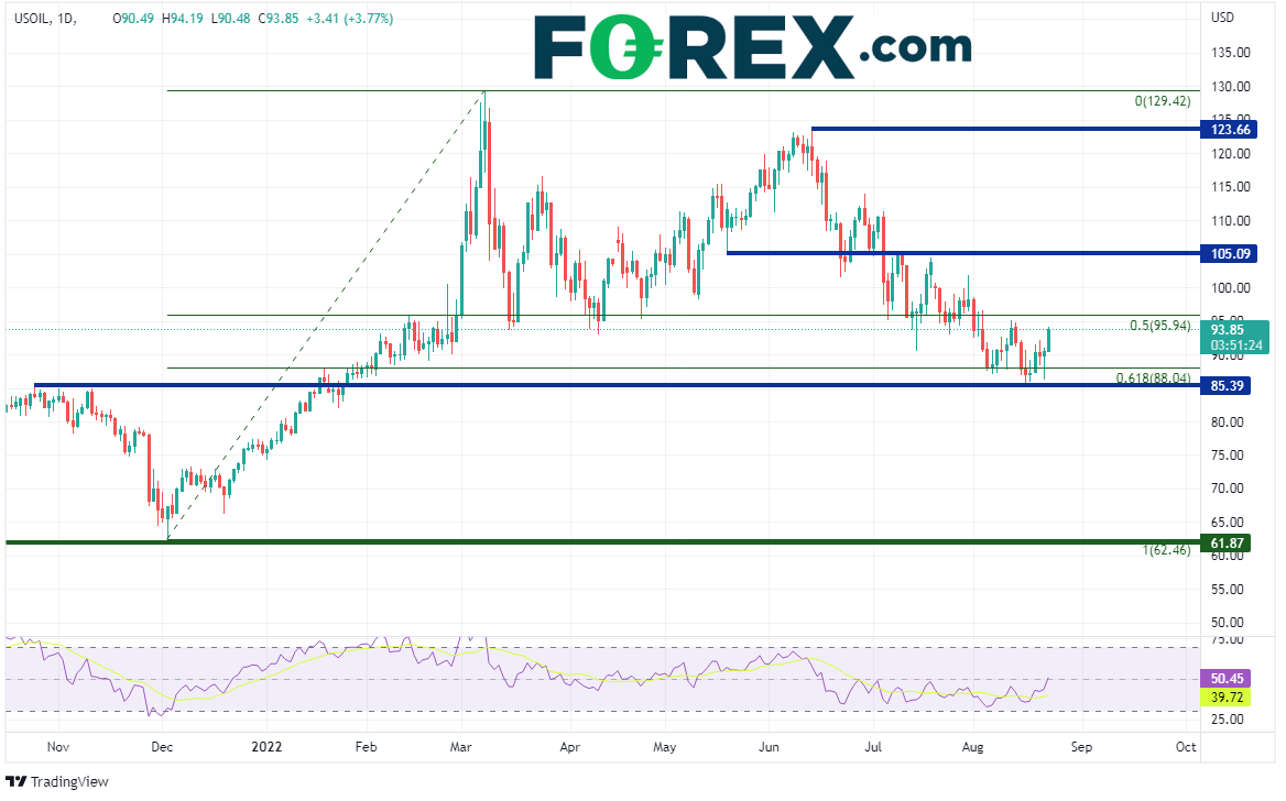 中国在周一早上下调1年期和5年期贷款报价利率,并且宣布计划向陷入困境的开发商提供290亿美元的专项贷款。这些举措都是为了激励经济增长。除了通胀加剧引发全球经济衰退的关切之外,现在又多了中国房地产市场崩盘的广泛担忧。另外市场盛传,伊朗-美国协议终于有望敲定,从而增加市场供应。该消息导致油价下跌,西得州原油在周一早上下挫4美元,至86.26低点,一度考验8月16日低点85.72。但就在数小时后,OPEC+新任负责人表示,OPEC目前正面临剩余产能不足的普遍困扰。油价因此调头向上,西得州原油收复所有失地,收高57美分,报在90.44附近。今天,油价继续上涨。有OPEC官员表示,如果全球经济衰退,则支持减产。西得州原油价格目前报在94.00附近。