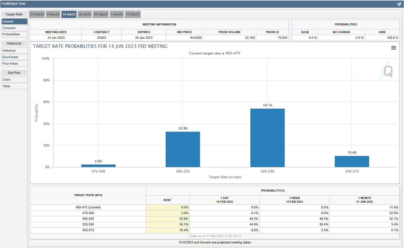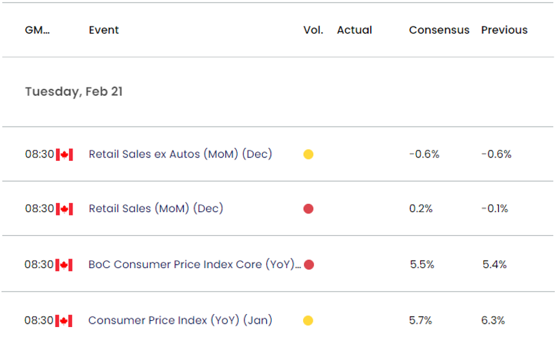 美国非农就业人数(NFP)上涨51.7万以及消费者物价指数(CPI)的居高不下似乎助长了对更严格政策的预期,因为CME FedWatch Tool现在反映最终的联邦基金利率在5.25%至5.50%的概率大于80%,美元可能在本月剩余时间内跑赢加拿大货币,因为加拿大央行(BoC)“预计将保持政策利率处于当前水平,同时评估累进加息的影响。”