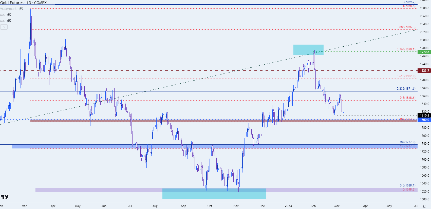 - 50%斐波那契点位落在1628,该点位在9月、10月和11月分别经受了三次考验。随着人们开始期待美联储可能会温柔对待市场,黄金多头重新入场,价格从11月低点上涨到2月高点,涨幅达22.05%。就在那时,76.4%斐波那契点位开始发挥作用,引发市场抛售并守住高点。