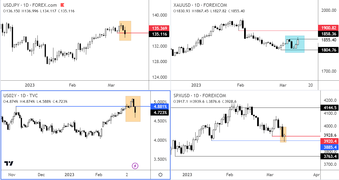 早些时候,我们看到股指期货在非农就业数据发布后的短暂反弹很快就瓦解了,现货市场一经开盘,抛售势头延续。标普金融指数暴跌。避险情绪今日更甚,SVB股价下跌超60%以后暂停交易,此前有消息称该银行筹集资金的尝试宣告失败。其他小型美国银行的股价也大幅下跌,尤其是市场听闻珍妮特·耶伦表示美国财政部在SVB引发的混乱后正在监控“多家银行”。投资者闻讯,涌入避险资产——国债、黄金和日元。外汇投资者涌入黄金、日元和瑞士法郎,而对风险敏感的商品美元兑欧元和英镑等货币都遭到抛售,欧元和英镑也随之强劲复苏。