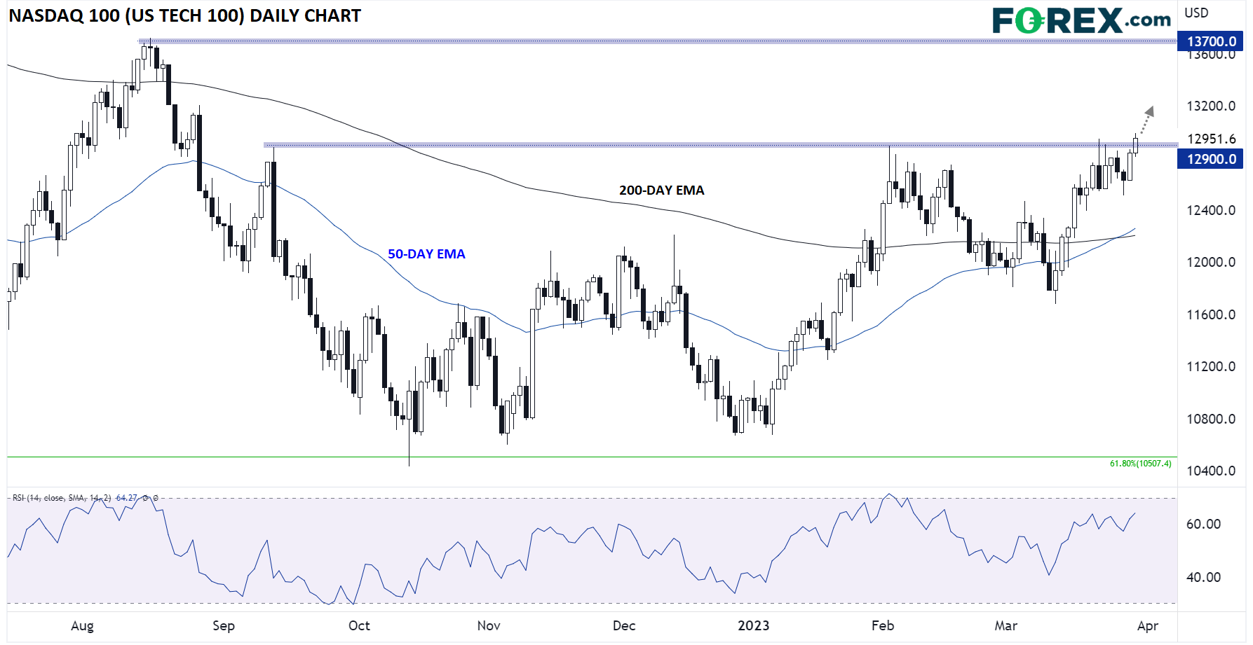 - 下一个值得关注的主要阻力位是2022年8月高点13,700附近