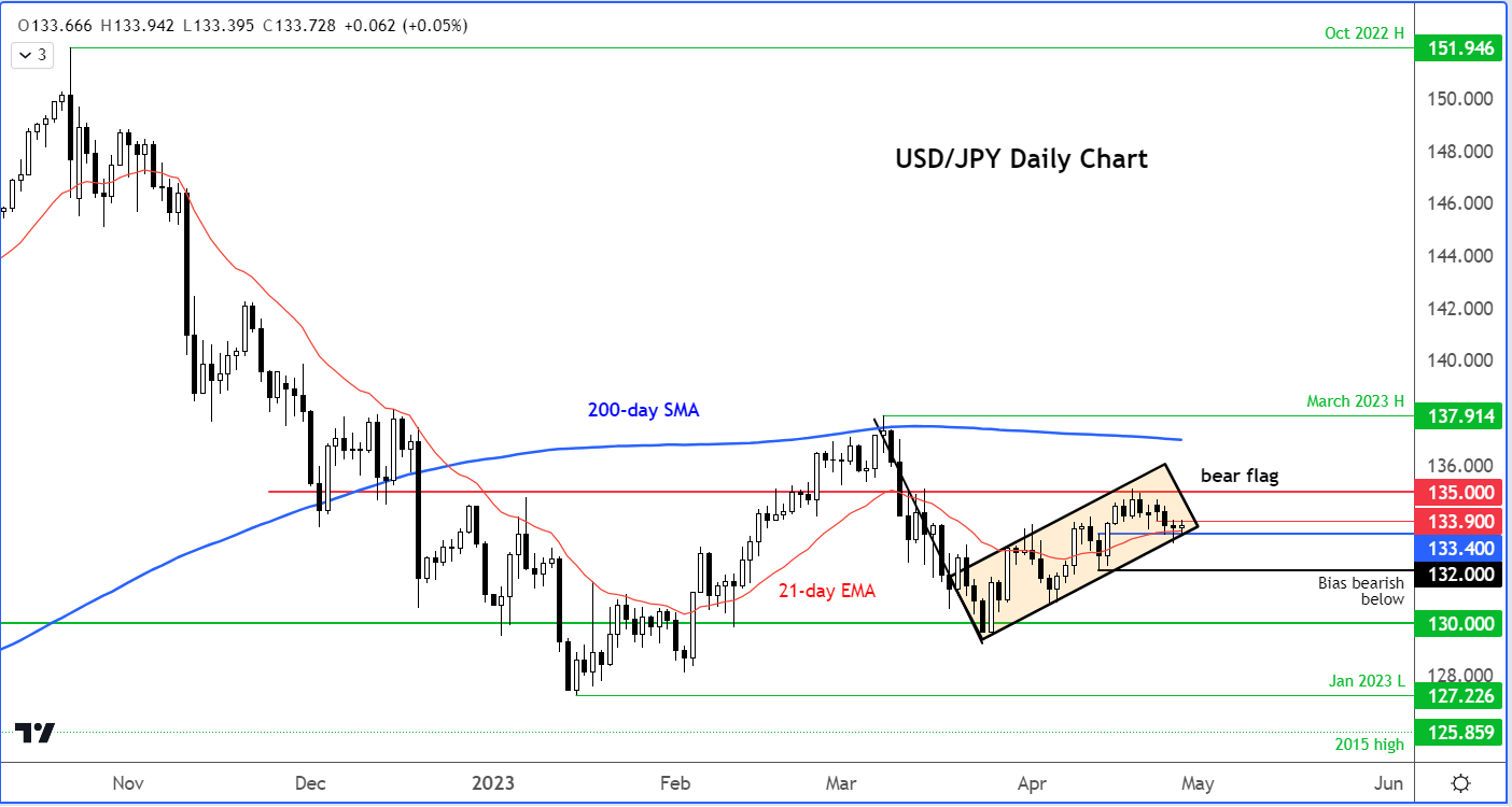 自1月份最低点以来形成一系列更高的低点肯定不是看跌指标。然而,美元/日元无法站上其200日均线意味着长期前景仍然看跌。事实上,现在日线图上开始形成看跌旗形: