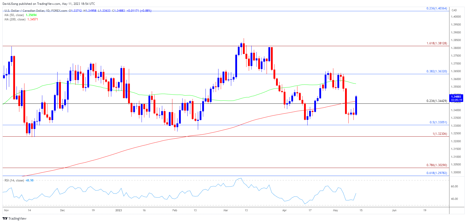综上所述,美元/加元可能会在加拿大CPI更新之前出现更大的反弹,因为它已在4月低点(1.3301)之前反转,而汇率可能会试着收复自月线高点(1.3640)以来的失地,因为它未延续上周的跌势。