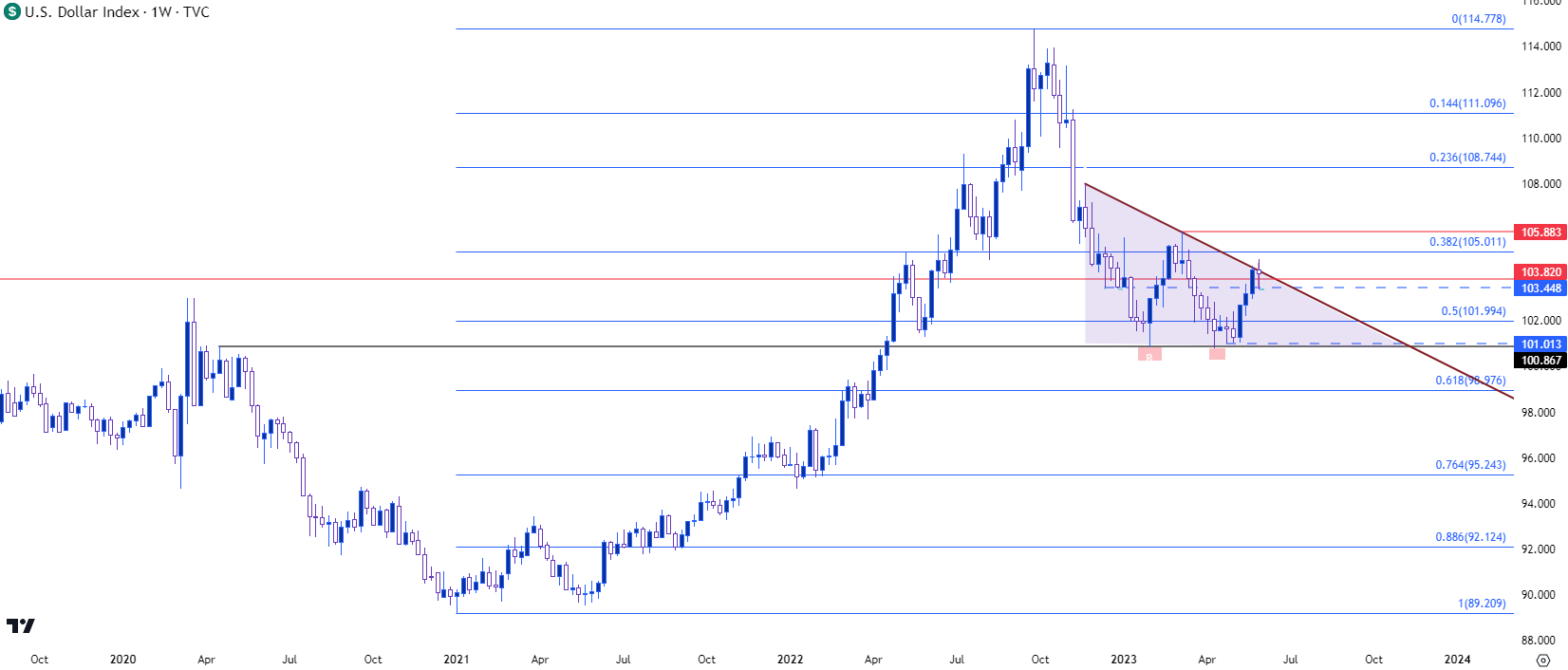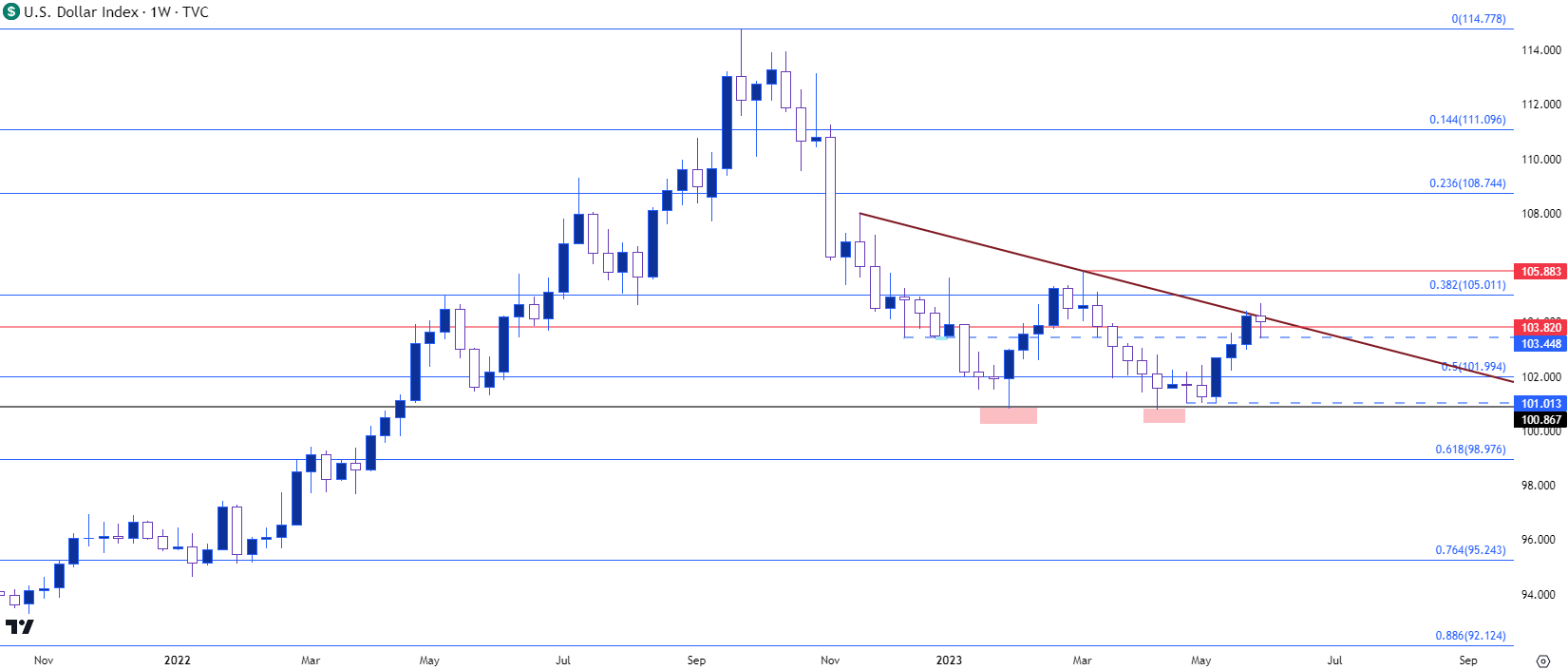 但是,对于美元来说,最大的问题是多头是否会在6月利率决议之前继续推动这一趋势,人们预计央行可能不加息,这被视为美元的看跌因素。但这是季度利率决议,所以还有另一个因素需要考虑,因为不加息可能伴随着一个更鹰派的点阵图,凸显美联储未来进一步加息的计划。如果发生这种情况,6月份不加息的部分动力可能会被下半年FOMC更加鹰派的可能性所抵消。