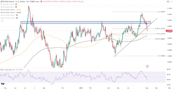 英国的降息决定和市场避险情绪导致英镑周四近1%的跌幅,在汇价跌破关键支撑区域和趋势线后,或在1.2673一线寻求进一步支撑,这里有100天均线和4-7月升势的50%回调位,其次是1.2600关口。