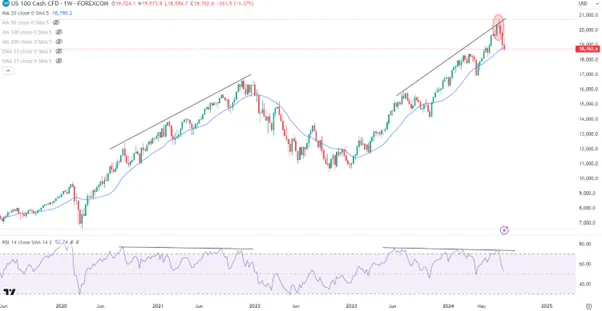 温和有序的降息预期是美股/科技股的利好,但若出现类似单次50个基点的紧急降息的情形,则通常意味着经济前景过度悲观衰退风险增加,而这可能会让市场情绪走向另一个极端。当前的纳斯达克100指数可能就处于情绪转换的过渡期,而与此同时科技巨头的财报表现也不足以继续帮助股价冲高。周线图上,若彻底跌破20周均线恐迎来更大程度的回调,上次发生这种情况还是在2021年11月。
