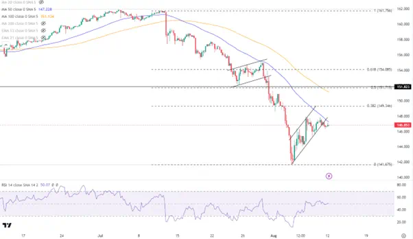 即使日本维持利率不变,美联储的降息预期仍可能继续压缩美日利差,而且汇价7月以来的下行压力短时间很难彻底扭转。因此在修正行情接近149以及151(100MA)附近时需要留意再次下探的风险。若跌破图中整理形态,141成为下方的关键支撑。