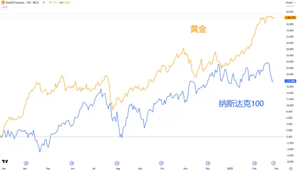 全球局势在特朗普2.0初期经历动荡,黄金则成为了投资者追捧的避险资产。黄金2024年上涨27%,是2010年以来最大的年度涨幅,今年截至目前累计上涨11%,同期涨幅都要好于以科技股为主的纳斯达克100指数。
