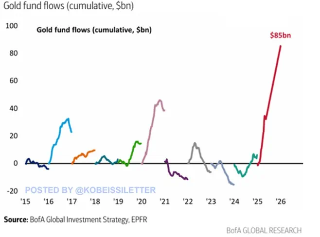黄金ETF资金流向2015-2025  来源:美国银行,EPFR