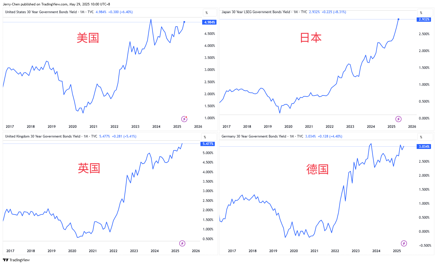 主要经济体30年期国债收益率  来源:Tradingview