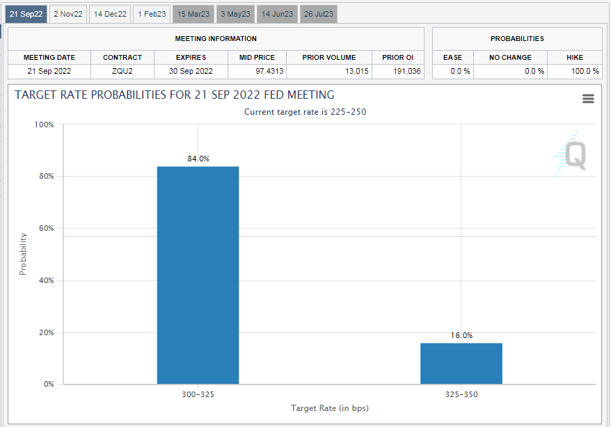 美国8月CPI年率从8.5%下降至8.3%,高于8.1%的预期值。但核心CPI才是交易员讨论的重点,其8月年率从5.9%上升至6.3%,高于6.1%的预期值。核心读数剔除了食品与能源价格,所以今天的读数可能表明,通胀不仅限于不稳定的食品与能源价格中。也就是说,通胀已渗透到美国经济的方方面面,波及整体商品与服务的价格。而通胀深入并盘踞于经济中正是美联储一直以来的深重忧虑。前述数据发布之后,根据CME的FedWatch工具,市场不仅计入84%的几率下周加息75个基点,还计入16%的几率加息100个基点。