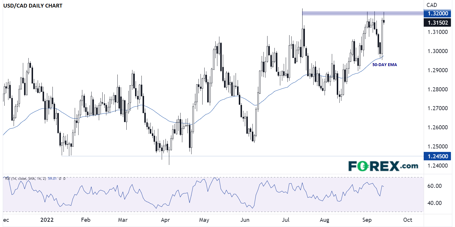 来看零售销售数据的潜在市场影响。受美国CPI高于预期的推动,美元昨天大涨,今天正在小幅回落。美元/加元方面,在测试关键前阻力位1.3200后目前回调。如果美国零售销售报告强劲,或增强美联储对实体经济的信心,进一步增加下周加息100个基点的砝码。如此一来,有可能带动美元/加元站上1.3200障碍。与此同时,如果零售销售疲弱,或引发美联储过度紧缩了银根,导致明年经济衰退的担心。这可能推动美元/加元回到1.3100下方,本周收盘下探1.3000一线中轨。