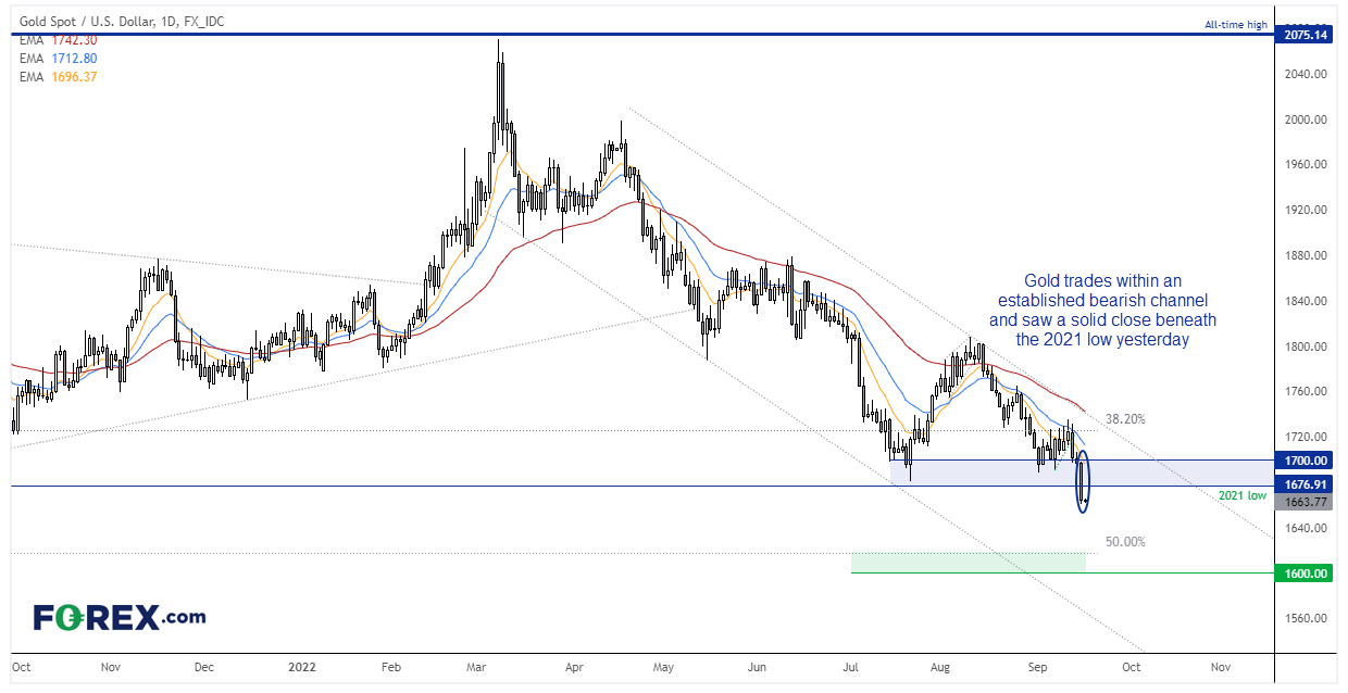 现货黄金昨天坚定收于2021年低点下方,可能吸引很多亚洲交易员今天察看图表并引发新一轮抛售潮。如果放大对黄金的观察视野,没人会指责交易员们的仓仓皇出逃。