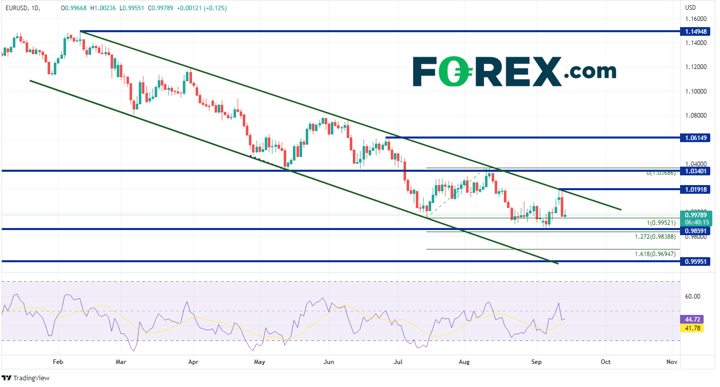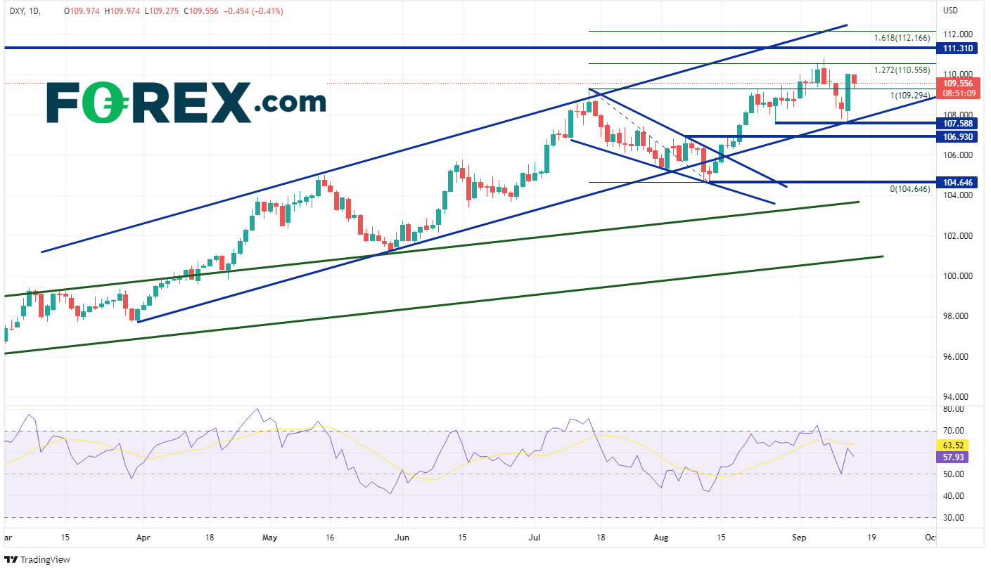 鉴于PPI数据喜忧参半,美元较数据公布前几无变化。但随着交易员获利了结,美元指数今天交投下挫。在昨天的CPI数据公布后,美元指数自8月26日低点和3月来该指数一直处于的长期通道上斜底部趋势线反弹。美元指数昨天上涨近171点!预计今天会有一些获利回吐行情,但并不说明美元指数不会继续上扬。首个阻力位在9月7日高点110.79。若升穿,价格或攻向水平阻力位111.31一线2001年9月阻力位,然后是7月14日高点至8月11日低点之161.8%扩展位112.17。首个支撑位在昨天低点107.68。若失守,美元或探向8月5日高点106.93附近支撑,然后下看8月11日低点104.65。