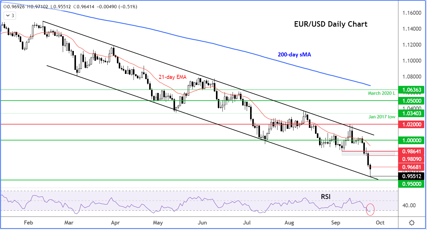 今天所有的焦点都在英镑/美元上,欧元/美元的一些剧烈波动可能被忽视。欧元/美元跌至年内新低,最低触及0.9551后回升至0.9700,最后又从该位缓慢回落。欧元/美元现已连续第五天下滑,但此文发稿时和英镑/美元一样脱离了低点,会出现一些逢低买盘吗?