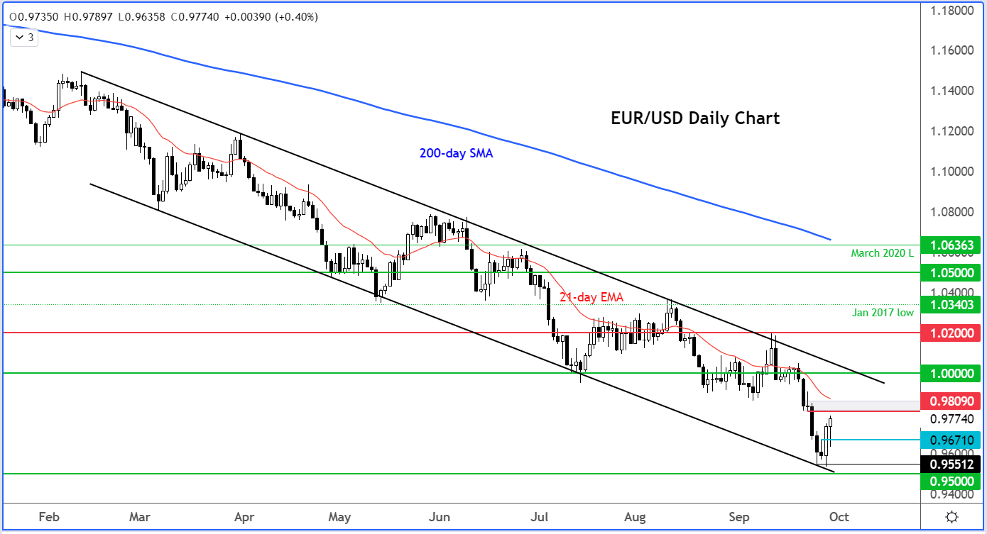 英国央行的干预举措一定程度安抚了债券市场。不仅英国,欧元区和美国债券市场的收益率都在下降。看跌投机气氛因此有所缓和,给予欧元等备受打击的风险资产一定的喘息空间。