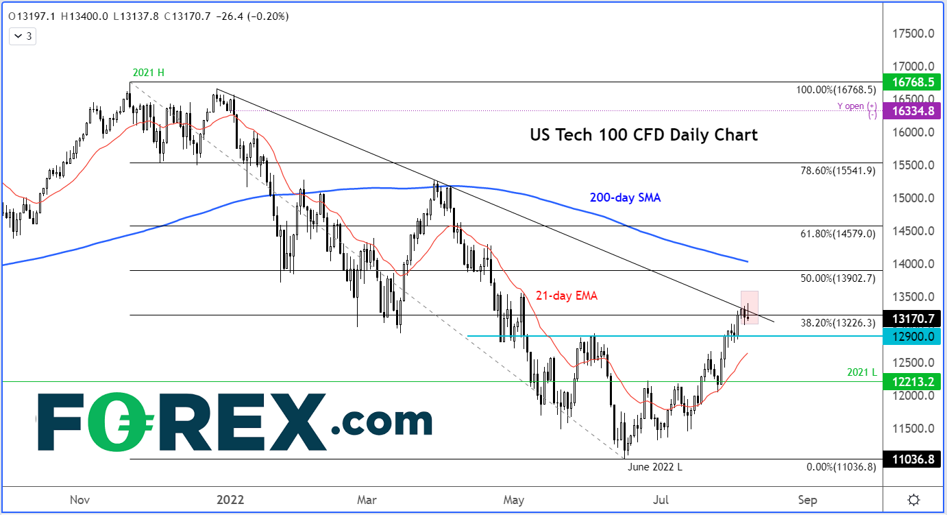 纳斯达克100指数早些时候站上其下降趋势线,但未能守于其上,随之调头向下。另外,38.2%回档位也构成看跌技术因素。