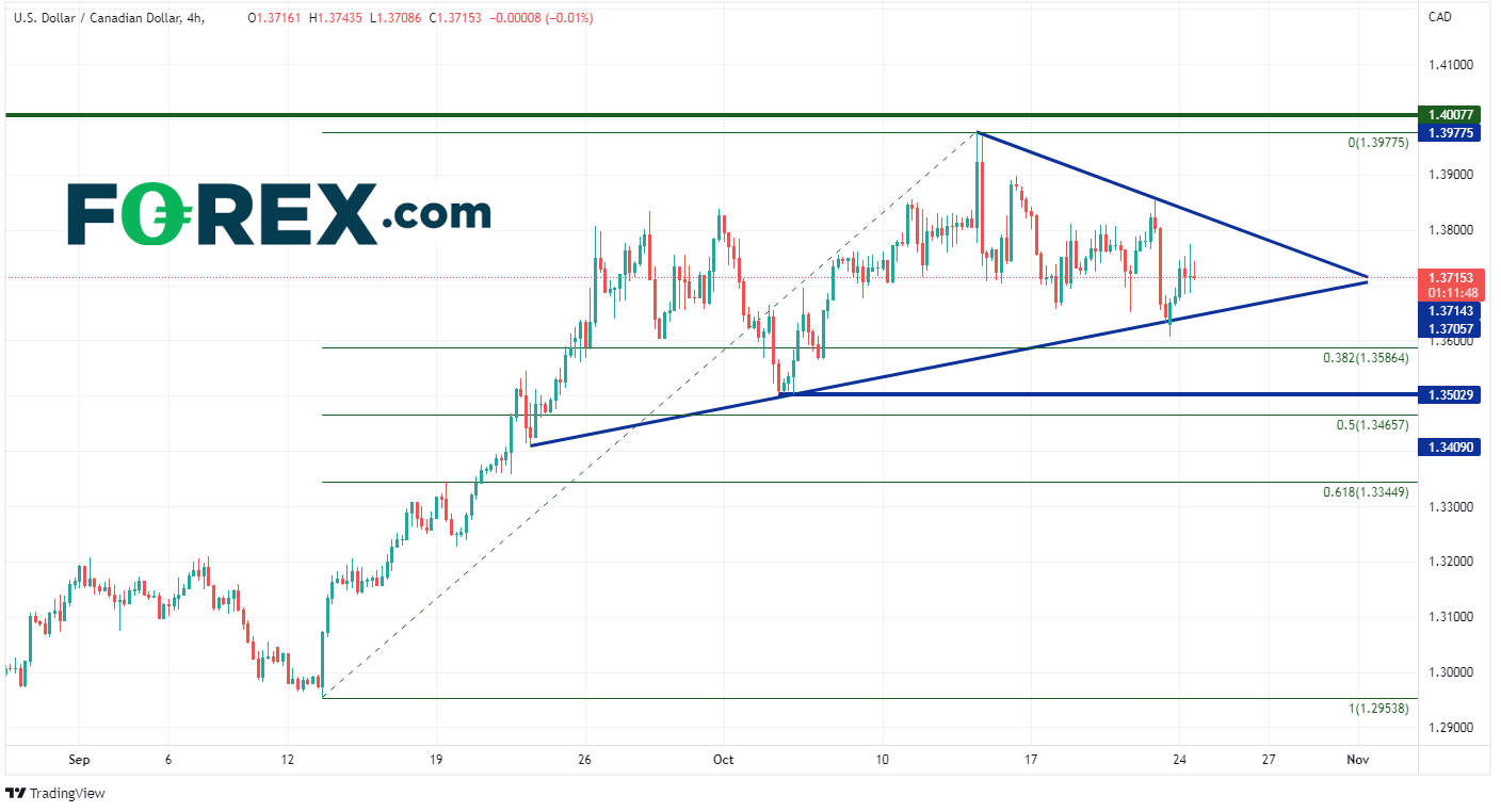 在4小时图中,美元/加元在对称三角形态中震荡,等待加拿大银行议息会议结果。如果货币对从上方突破,则第一个阻力位将位于1.3854(10月21日高点)。突破该位后,美元/加元将向10月13日高点1.3855和2020年5月高点1.4008攀升。但如果美元/加元下跌,则第一个支撑位则落在9月13日低点至10月13日高点的38.2%回档位1.3586。继续向下,10月4日低点1.3503将是第二支撑位,位于其下方的50%回档位(9月13日低点至10月13日高点)1.3466为第三支撑位。